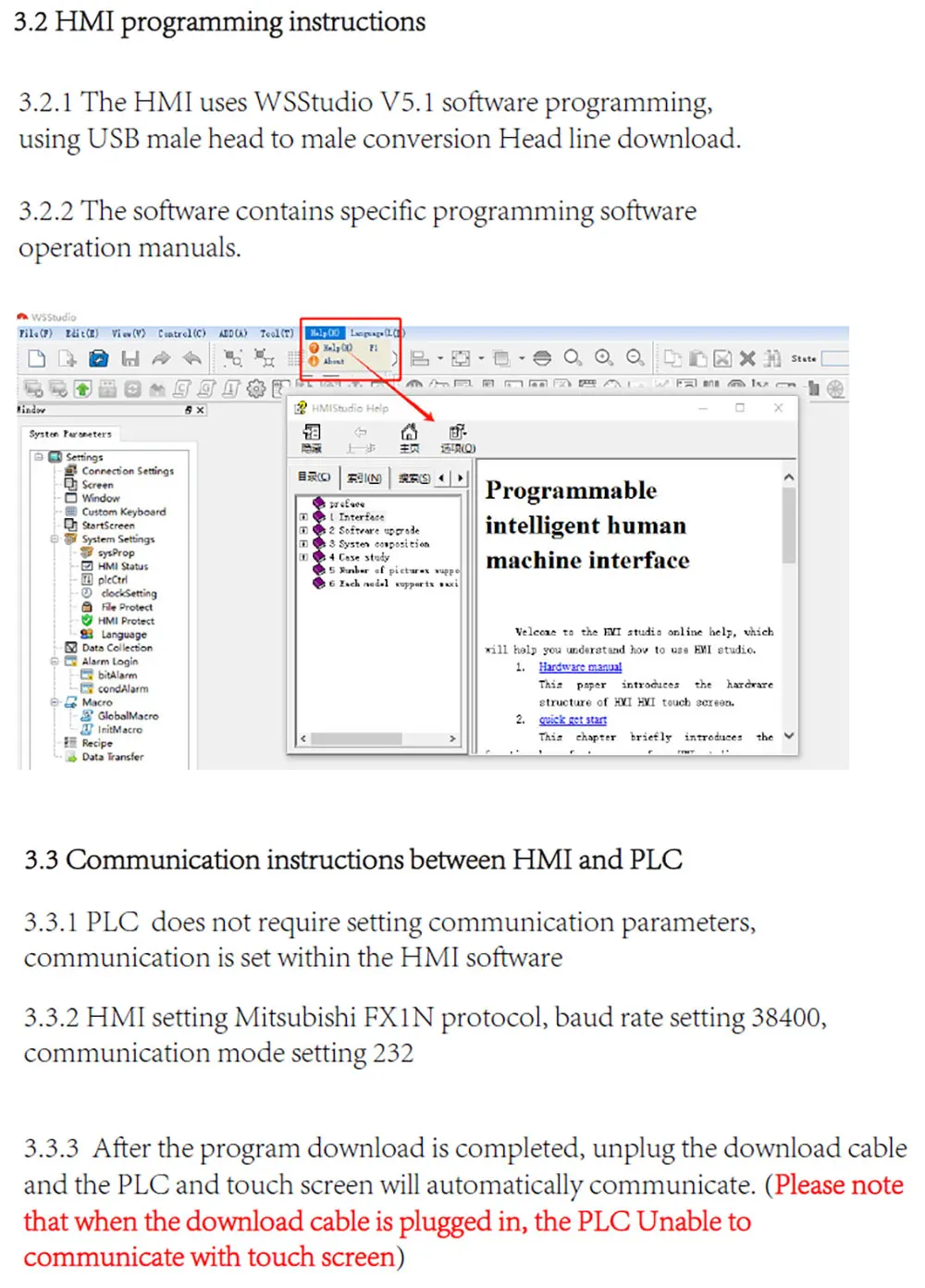 (2) PLC supports Mitsubishi GX developer or GX works 2 software ladder diagram programming, and the HMI use WSStudio v5.1 software programming.