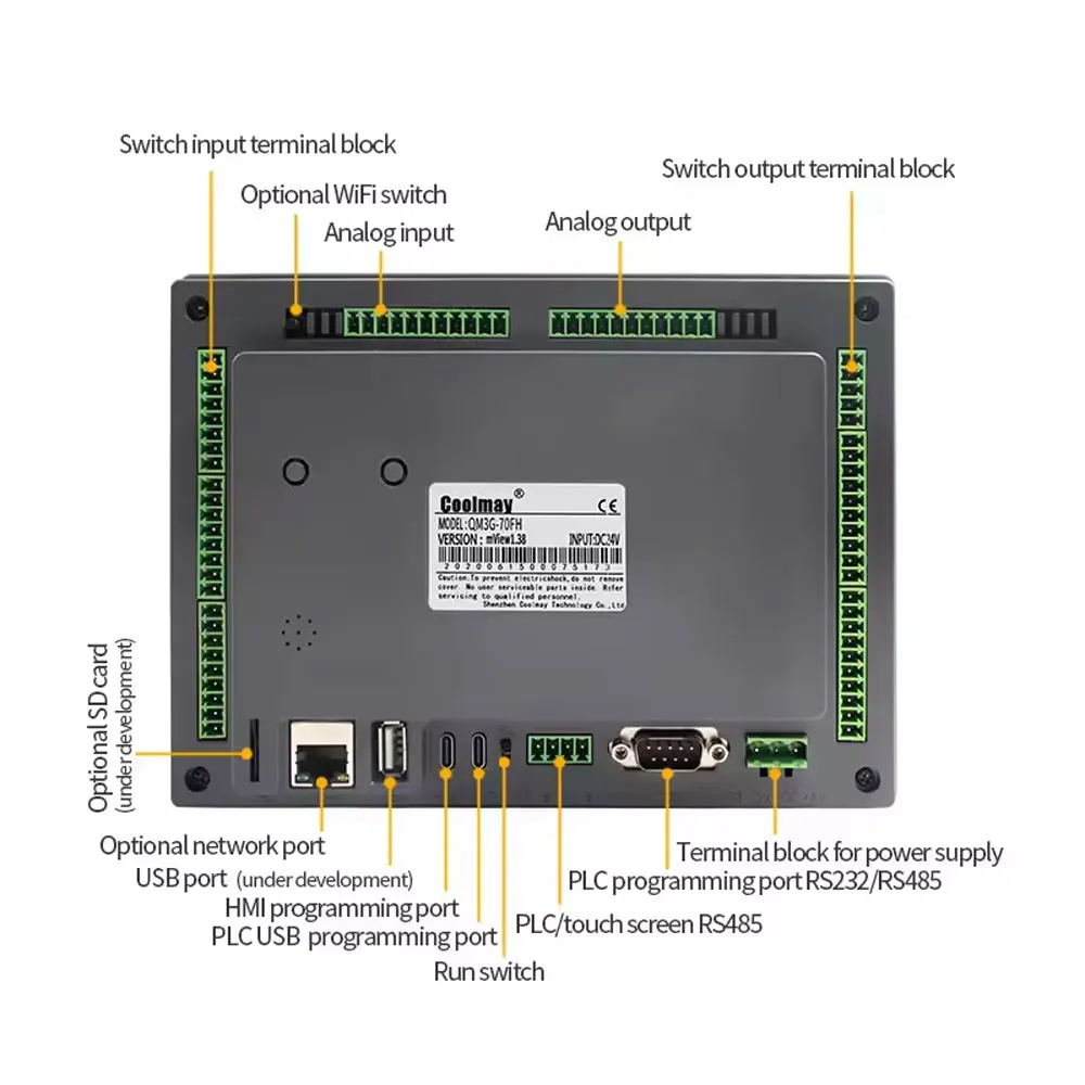 7inch HMI PLC all in one, 24DI 20DO(Maximum 16 relay outputs, Y20-Y23 are fixed as transistor outputs),Optional maximum 8 Analog inputs and 6 Analog outputs(Extra charge), 1 RS232(HMI), 1 RS232(PLC),1 RS485(PLC).