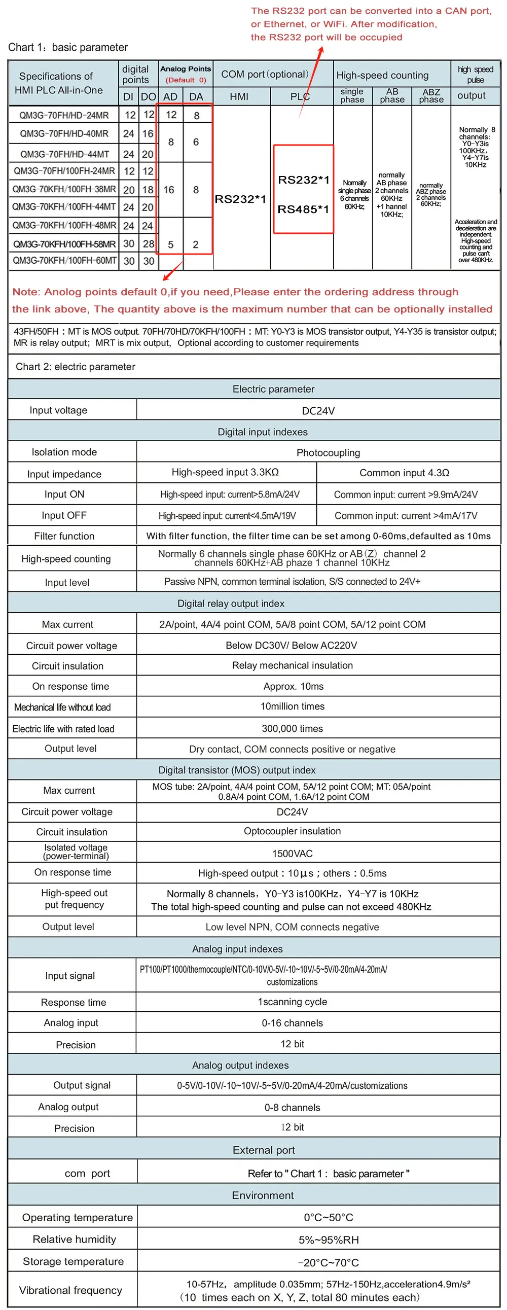 10 inch HMI PLC all in one,30DI 30DO(Maximum 28 relay outputs, and Y22 and Y23 are fixed as transistor outputs),Optional maximum 5 Analog inputs and 2 Analog outputs(Extra charge), 1 RS232(HMI), 1 RS232(PLC),1 RS485(PLC).